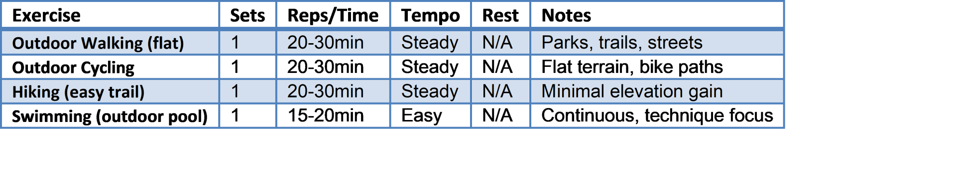 Target: Build base with outdoor activities | Frequency: 3-4×/week | Time: 45-55min