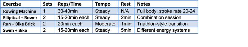 - Week: 8-12 hours total training volume | Mix of swim/bike/run/row